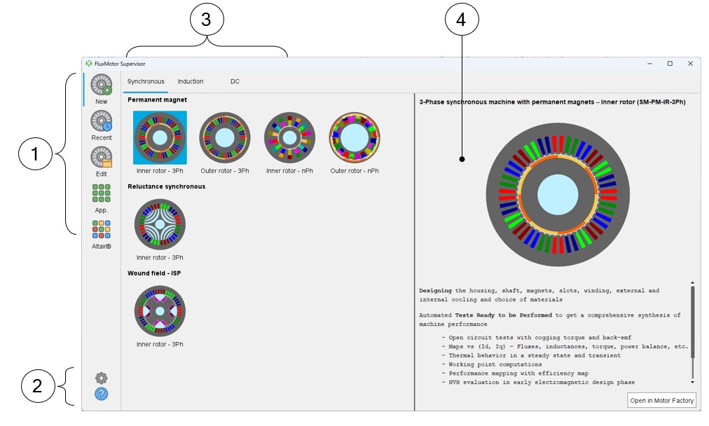| 1 | Main entry points of the supervisor – New motor in Motor Factory, edit a Recent motor, Edit a motor from catalogs, Open FluxMotor satellite Applications, Open Altair® solutions. |