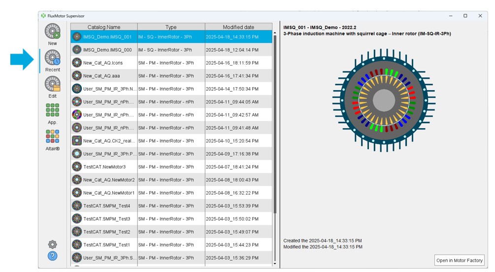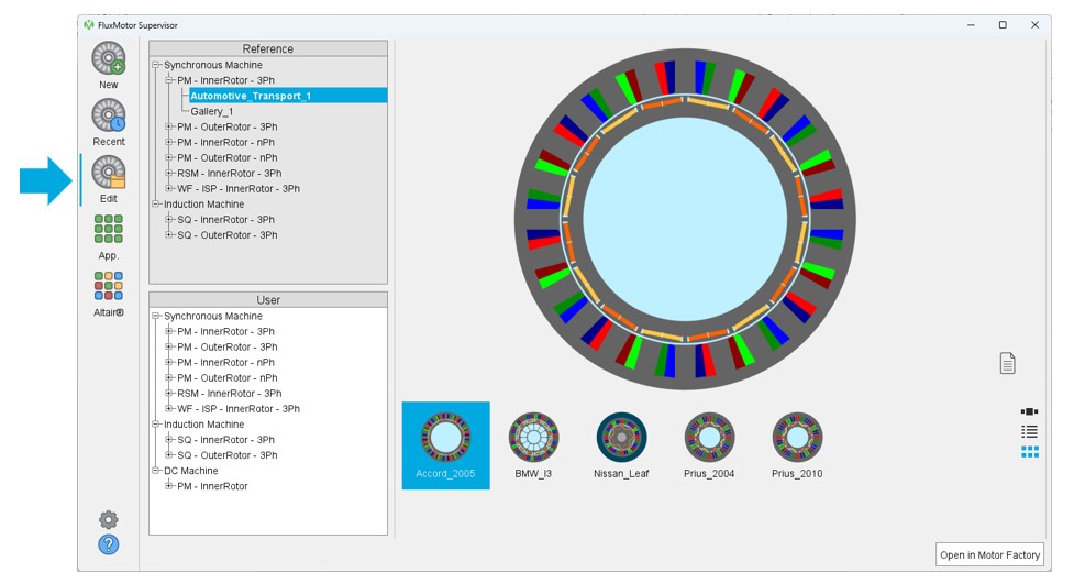 Double clicking on the icon of the machine or clicking on the button Open in Motor Factory edits the machine in Motor Factory design environment.