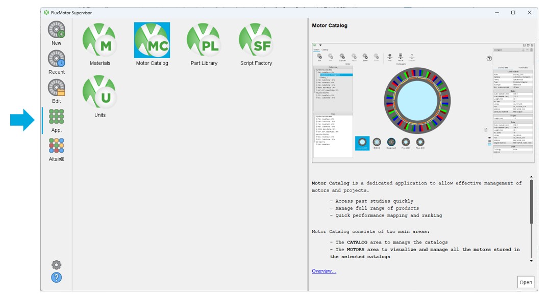 - “App”: to access the FluxMotor satellite applications like Motor Catalog, Part Library, Materials, Units, Script Factory, etc.