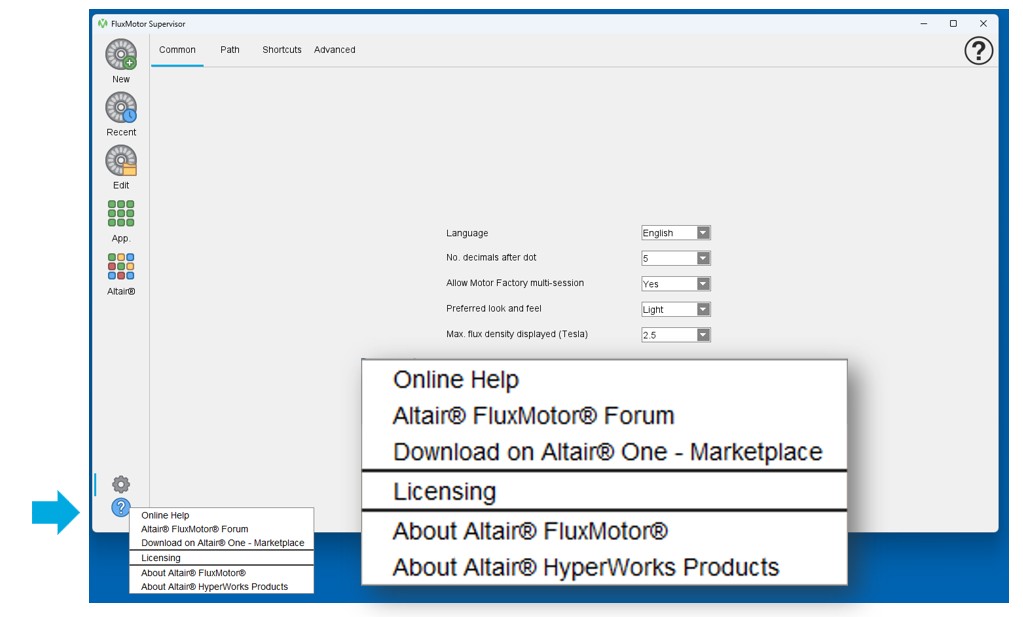 Access to the User help guide, licensing, access to the Forum – Community and the download on Altair® one Marketplace, + information about Altair® FluxMotor® and Altair® HyperWorks products with Customer Support, Web pages, copyright and legal notices, and third party libraries. |
