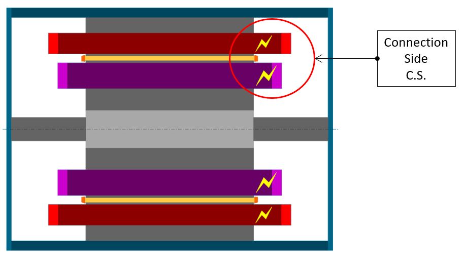 | Dimensions are illustrated with arrows | Connection side (C.S.) is identified by yellow lightning. |