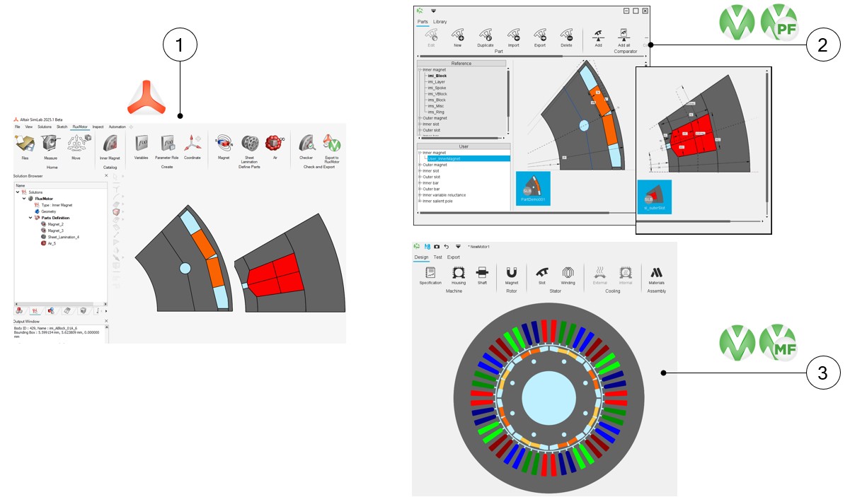 | Workflow between SimLab sketcher (1), Part Library (2) and Motor Factory (3) |