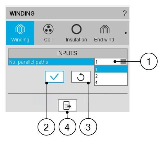 | 3 | Button to restore default input values. Default values are those that defines the winding architecture by using the automatic mode. |