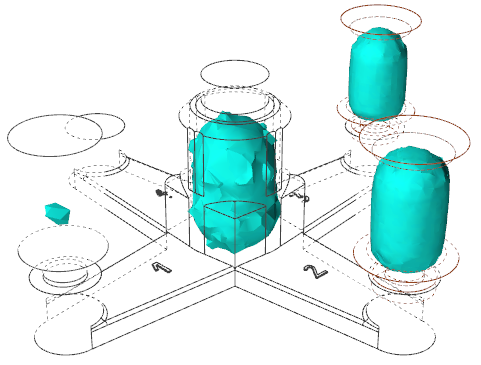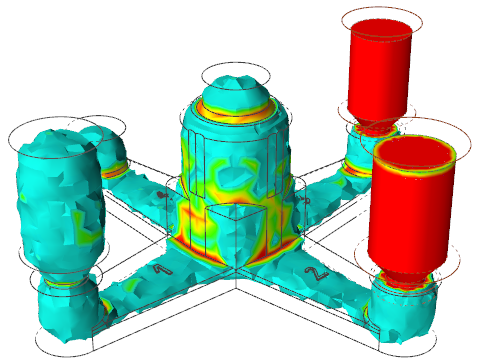 In the animation, solidified material (above 0.7) is transparent, while liquid material (below 0.7) is shown colored. Shrinkage porosity is more likely to occur in isolated areas.Despite the diminished size of the second and third risers, they are able to feed the part longer because of the effect of the sleeves.