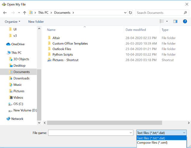 [name,filepath,index] = uigetfile({'*.txt;*.dat','Text files';'*.oml','Compose files'},'Open My File');