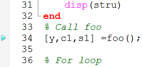 The blue arrow indicating the next line to be executed is now at line 34. Use