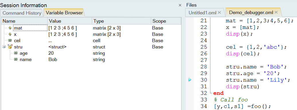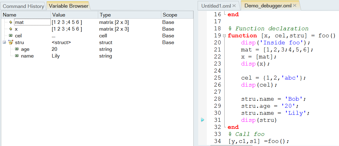 Investigate Variables in a Function Using the Variable Browser and Watch Window.