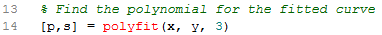 The output is shown below. The first output, p, contains the fitted polynomial coefficients. The second output, s, contains statistical data. Only the norm of the residuals vector is shown here.