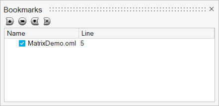 Individual bookmarks can be disabled by deactivating the box next to it. Bookmarks can also be created and deleted from this window. Clicking a bookmark positions the cursor at that location in the Editor. Use the arrow keys to cycle through the bookmarks.