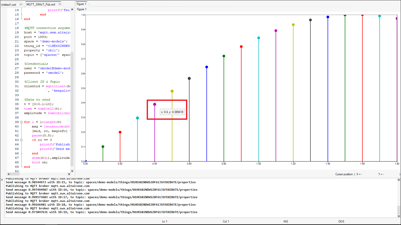 for i = 1:length(t) msg = jsonencode(struct(property, struct('amplitude', num2str(time{i}), 'time', num2str(amplitude{i})))); [mid, rc, msginfo] = mqttpublish(clientid, topic, msg, 2, true); pause(0.5); if rc == 0 printf('Publishing to MQTT broker %s\n', host) printf('Send message %s with ID:%s, to topic: %s\n',num2str(amplitude{i}),num2str(mid), topic) end stem(t(i),amplitude{i}); hold on; endIt is possible to see that the data sent from Compose is being received on IoT Studio using the MQTT protocol.