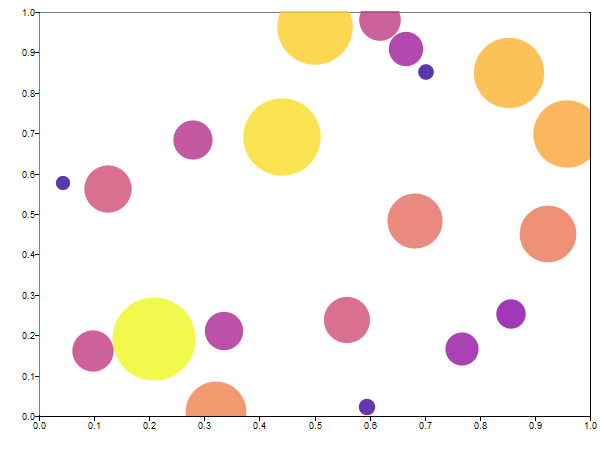 bubblechart(x, y, s, cdata, 'markerfacealpha', 0.8);