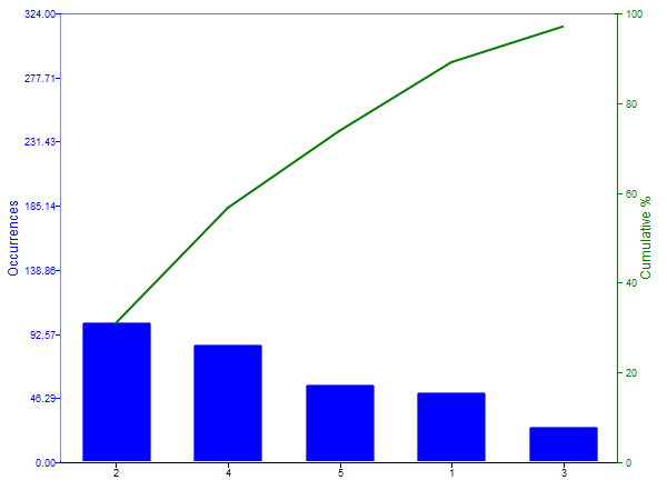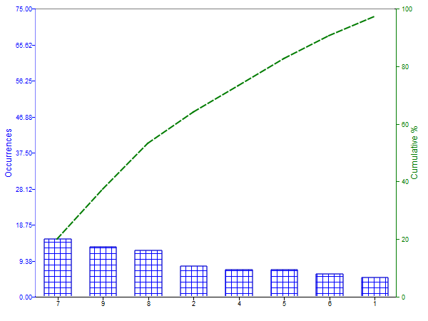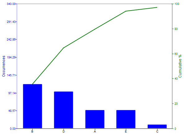 The pareto plot consists of a bar chart and a line. The bar chart, plotted on the left vertical axis, shows the frequency of occurencies (y) in descending order. The line, plotted on the right vertical axis, presents the cumulative percentage of the total number of occurances.