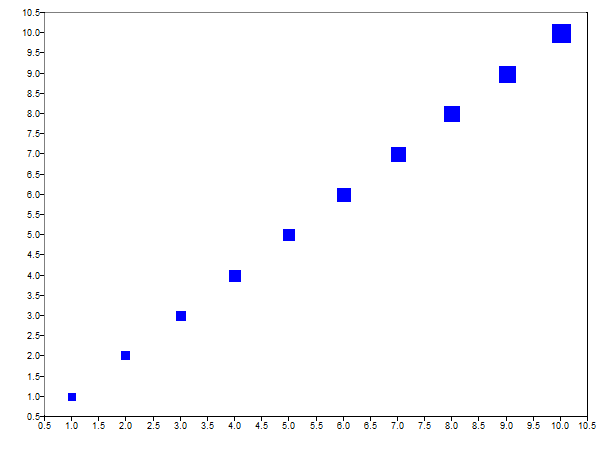 s = scatter(1:10,1:10, 1:10)