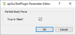 void CApiTestParticleBodyForce::setApiParametersTemplate() const { auto* apiManager = getApiManager(); auto* pluginParamaterManager = apiManager->getParameterManager(); pluginParamaterManager->startGroup(NPluginParamsGroupNames::PARTICLE_BODY_FORCE); pluginParamaterManager->addBoolValue(false, "True or false?"); pluginParamaterManager->endGroup(); }bool CApiTestParticleBodyForce::starting( int numThreads, char guiPath[NApi::GUI_FILE_MAX_LENGTH]) { auto* apiManager = getApiManager(); auto* pluginParamaterManager = apiManager->getParameterManager(); pluginParamaterManager->openGroup(NPluginParamsGroupNames::PARTICLE_BODY_FORCE); m_myBoolean = pluginParamaterManager->getBoolValue("True or false?"); pluginParamaterManager->endGroup(); return true; }