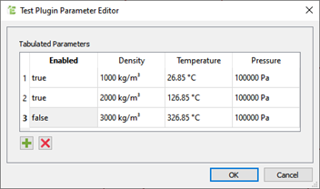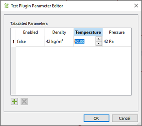 pluginParamaterManager->startGroup(NPluginParamsGroupNames::PARTICLE_GEOMETRY); pluginParamaterManager->startTable("Tabulated Parameters"); pluginParamaterManager->addTableBoolColumnHeader(true, "Enabled"); pluginParamaterManager->addTableDoubleColumnHeader(1000, "Density", NApi::eDensity); pluginParamaterManager->addTableDoubleColumnHeader(100.0, "Temperature", NApi::eTemperature); pluginParamaterManager->addTableDoubleColumnHeader(1000.0e3, "Pressure", NApi::ePressure); pluginParamaterManager->startTableRow(); pluginParamaterManager->addBoolValue(false, "Enabled"); pluginParamaterManager->addDoubleValue(42, "Density"); pluginParamaterManager->addDoubleValue(42, "Temperature"); pluginParamaterManager->addDoubleValue(42, "Pressure"); pluginParamaterManager->endTableRow(); pluginParamaterManager->endTable(); pluginParamaterManager->endGroup();Note: In this case, you can still edit the values of those rows but you cannot remove the rows. Therefore, a minimum number of rows is enforced.