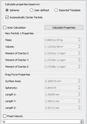 - Click Calculate Properties to calculate the mass, volume, and moments of inertia for the current particle.