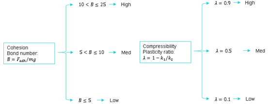 • The bulk cohesion and compressibility, which are qualitatively categorized using the bond number and the EEPA contact plasticity ratio respectively.