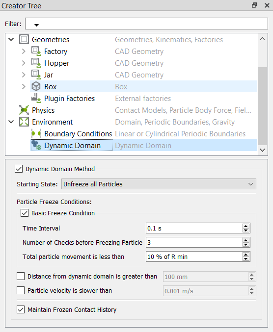 Particle Freeze Conditions Basic Freeze Condition Indicates the default freeze condition. It is advised as a precautionary measure to only freeze particles that have definitely settled. After the chosen number of checks, particles will only be frozen if they have traveled less than the specified amount. Time Interval Indicates the frequency at which EDEM checks the particle. The smaller the frequency, the greater the impact on the performance, but the quicker particles will likely be frozen. Number of Checks before Freezing Particle Indicates the number of checks required to ensure that the particle has not moved. Total particle movement is less than Indicates the total allowable movement for a particle to be considered stationary. Distance from dynamic domain is greater than Indicates that particles will be frozen as soon as they reach a certain distance away from the Dynamic Domain boundaries. Particle velocity is slower than Indicates that particles will be frozen as soon as their velocity drops below the specified value. Maintain Frozen Contact History Indicates if the contact history of the frozen particle is maintained or discarded. If the contact history is not required for analysis, this can be utilized to decrease the simulation's file size. Note: Any material inside the domain will be active and any outside may become frozen. Frozen particles do not apply forces on Geometry sections and are excluded from Contact Detection. Forces and velocities are not computed. Dynamic Domain is based on the Method outlined in Mio et al., 2009.
