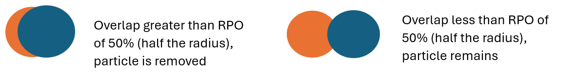 Remove Particle Overlap Indicates a percentage of the particle’s radius and is the main criterion of the overlap filter. Any particles with overlap higher than the defined value are removed. Which means, the lower the value, the more particles are removed. The algorithm starts at a high percentage and then ramps down to the user-defined value, allowing for the adjustment of the positions of the remaining particles.