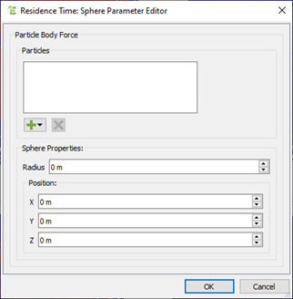 In this example, you are defining a sphere to track the Custom Residence Time. Although the simulation includes an additional  particle type (New Particle 2), because it is not displayed in the Particles list in the dialog box, particles of this type will not have a value added to their Custom Residence Time attribute, unlike the particles of type New Particle 1.