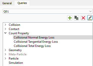 The output of the model is stored in three counter custom properties that track collision counts and energy losses for both Particle-Particle and Particle-Geometry collisions.