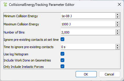For Specify Minimum Collision Energy Indicates the lower bound of the energy loss histogram. This is a lower bound on the values that will be stored in the three counter custom properties. Maximum Collision Energy Indicates the upper bound of the energy loss histogram. This is an upper bound on the values that will be stored in the three counter custom properties. Number of Bins Indicates the number of bins to use in the energy loss histogram. This corresponds to the number of bins in each of the three counter custom properties. A larger value gives a better resolution but also potentially increases the noise of the data, meaning further post-processing may be required. Ignore pre-existing contacts at set time Indicates that contacts existing at the corresponding time will not be included in any calculations of the model, if enabled. This is useful if an exported deck with pre-existing contacts has this model added to it. Having this option enabled prevents the inclusion of data coming from collisions where only part of the collisional energy loss is summed. Time to ignore pre-existing contacts Indicates the time at which contacts will not be included if the previous setting is enabled. This should typically be the simulation start time. Use log histogram Sets the spacing of the bins to be distributed logarithmically, as opposed to linearly. Enabling this option is highly recommended. However, if you want to analyze negative energy loss values, a linear histogram with a negative minimum collision energy can be used instead. The energy loss values cannot be negative while this option is enabled. Include Work Done on Geometries If enabled, Particle-Geometry contacts are treated as identical to Particle-Particle contacts. If disabled, work done on the Geometries is ignored (the calculation is done as if the Geometries always have zero velocity.) With this option enabled, a steady-state system driven by Geometry motions and fixed particle count will show a net loss due to collisions, due to energy input from the Geometry kinematics being dissipated in the collisions in the system. With this option disabled, the Particle-Geometry collisions will exhibit large negative losses and the collisional energy loss as a whole will sum to zero in the steady state (it may be necessary to disable Only Include Inelastic Forces to achieve this. Only Include Inelastic Forces If enabled, only inelastic forces are used in the calculations. For more information about how they are used in calculations, see Potential Issues with Energy Loss Calculation. Note: The default values and selections are considered an appropriate starting point for most simulations. - Click OK.