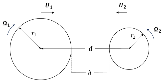 being modeled.Figure 1. Schematic for two particles of radius r_1 and r_2, with linear velocities