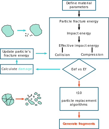 After the material is set up with the use of relevant parameters, EDEM detects impacts and calculates the energy absorbed from each impact event. The recorded impact energy is assigned accurately to each element involved in the collision based on their stiffnesses and it is compared with the stored fracture energy of the particle. If the first value is smaller than the second value, the particle will not break but suffer damage that will subsequently create a new fracture energy to the particle, which will be lower than the previous one.