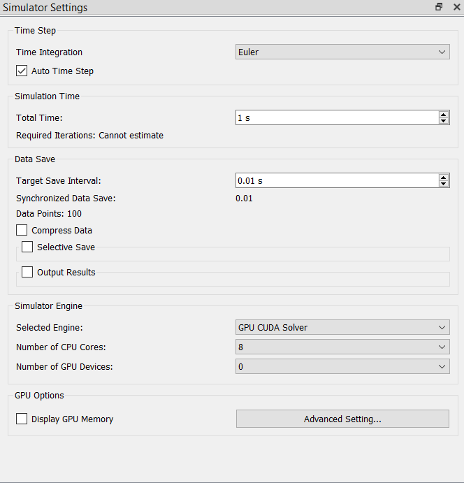 You can set simulation parameters such as the Time Step, simulation time, grid options, and Simulator Engine for the CPU mode, along with the GPU parameters.