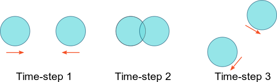 At Time Step 1, they are some distance apart. The particles are traveling towards each other at some speed, and their positions appear to overlap when recalculated at Time Step 2. At this point, the particle forces and energies are recalculated. However, these values are extremely high due to the apparent overlap, which provides each particle with an extremely large and inaccurate velocity, and they travel erratically at Time Step 3. As a result, these particles can collide with other elements in the system, resulting in a 'explosion' of wrongly moving elements.