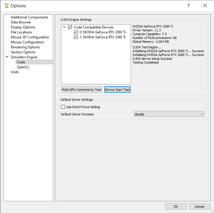 Note: The device test is required before running EDEM CUDA GPU on a machine for the first time. The device test will check the GPU compatibility and make the GPU card(s) available for EDEM Simulator. The test will also ensure that the current GPU devices support compute capability 3.5 or more, which needs to be supported in order to utilize Double Precision.If the test runs successfully, the GPU devices are ready to be selected as Simulator Engines, if not, EDEM will provide information about the problem.
