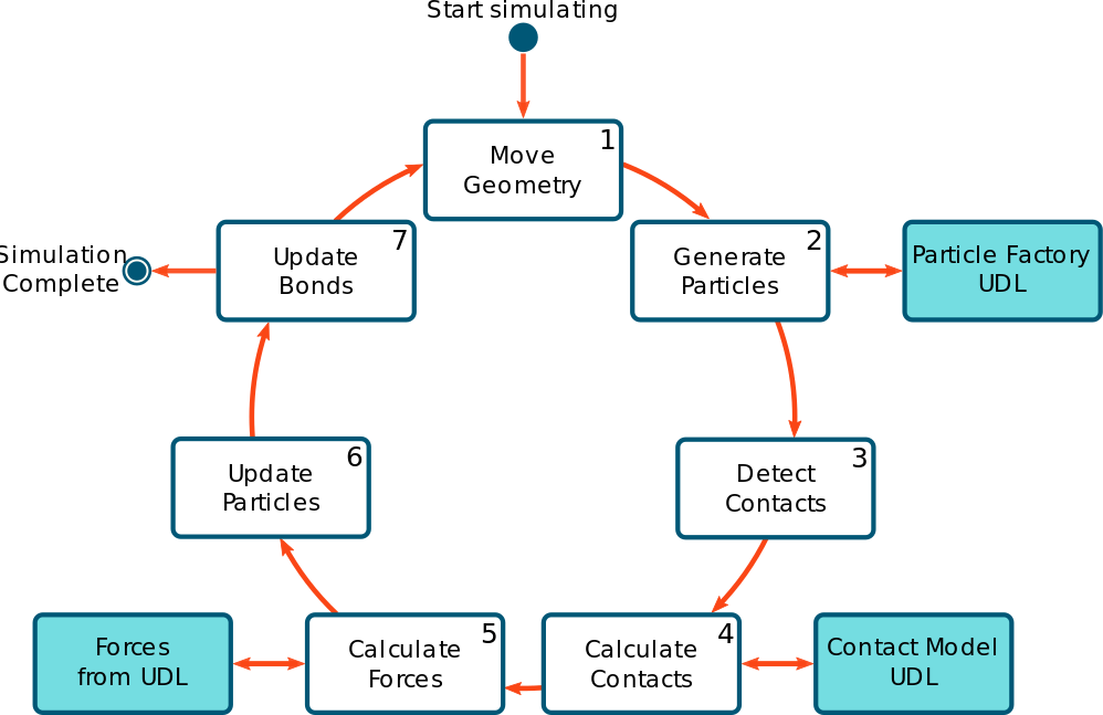 The following diagram represents UDL libraries when they are called during EDEM's simulation sequence: