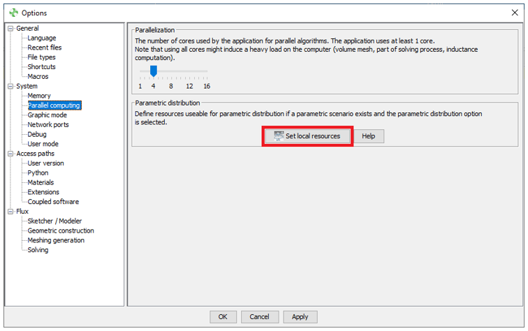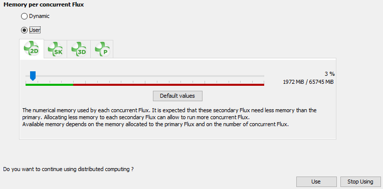 This number is directly linked to the number of cores available on the machine, the numbers of varying parameters are automatically distributed over the number of concurrent Flux. The secondary Flux is automatically run in mono core mode but may be changed by using the slider Number of cores per concurrent Flux.