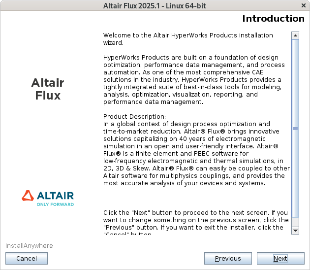 - Read the introduction and click on the Next button to continue with the Altair Flux 2025.1 installation