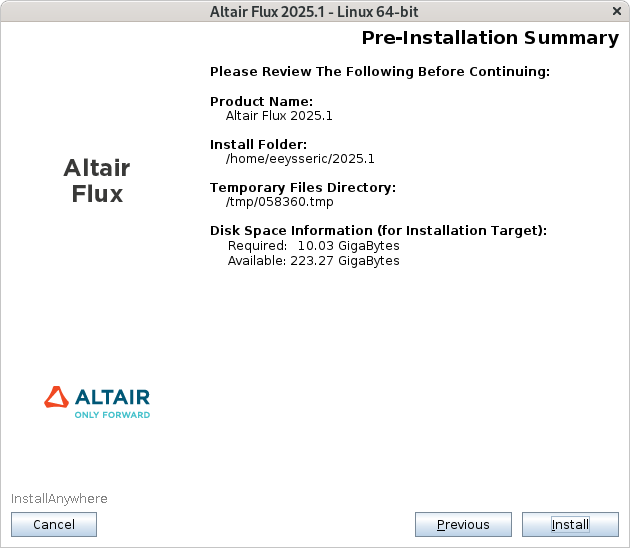 - Review the installation details and click on the Install button to start the Altair Flux 2025.1 installation