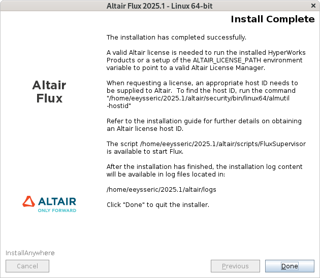 - Click on the Done button to complete the Altair Flux 2025.1 installation and exit the installer
