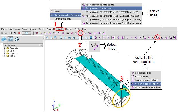 To activate the Assign mesh line command, which requires data selection , choose one of the methods presented in the figure below: