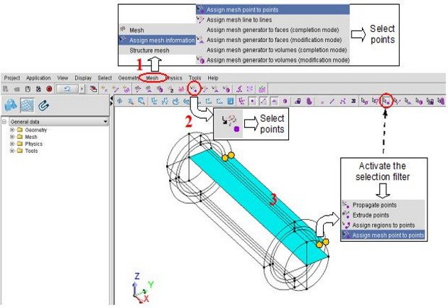 - The number of points of a geometric model can be large, and selecting each point in turn could easily become burdensome. Thus, it makes sense to clearly distinguish areas to be meshed with elements of the same size and then to select the points of these areas by criterion (Selection of points by means of a face, a volume, a region, etc.).
