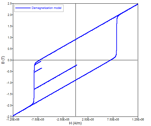 With this non-linear model, it is also possible to consider the demagnetization during solving (i.e. the irreversible degradation of a magnet's remanent magnetic flux density due to its interaction with a demagnetizing field) by checking the specific option that is provided during the material creation. This demagnetization model is based on a static Preisach approach and may apply in all quadrants of the magnet B(H) characteristic. The following additional remarks apply: