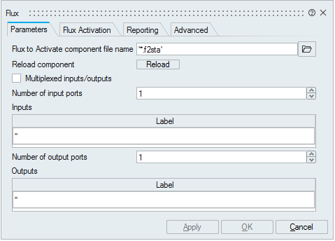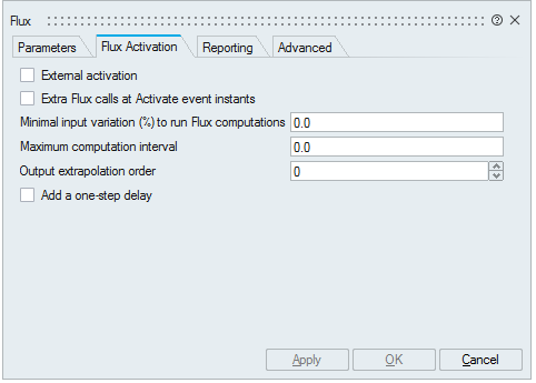 | External activation | This parameter defines if the block receives an external activation or inherits. When "external activation" is used, an additional activation port is added to the block (red). If "external activation" is enabled, the Flux engine does the computation only at event instants, e.g., at a fixed-rate defined by an external clock. If this option is enabled, the "Minimal variation (%) to run Flux computation" and "Maximum computation interval" fields are disabled. |