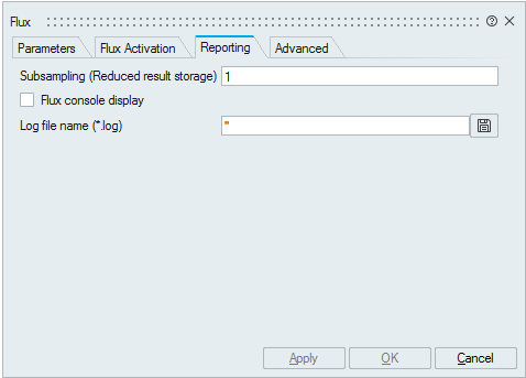| Subsampling (Reduced result storage) | Limit the number of files where Flux stores the results, and then it saves hard disk space. Moreover, the number of steps on which the user can post process the results is also limited to one step on n, n is the number indicated in this field. This number must be greater or equal to three. The number of Flux files storing the results is adapted according to the n value. |
