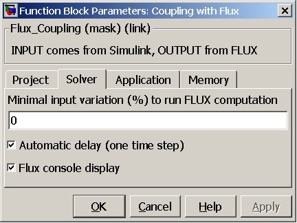 | Minimal input variation (%) to run FLUX computation | Permits to define a percentage of variation of the input parameters between two calculation steps under which the Flux calculation will not be carried out. What matters is to be able to carry out several Simulink time steps, without systematically carrying out a Flux calculation. |