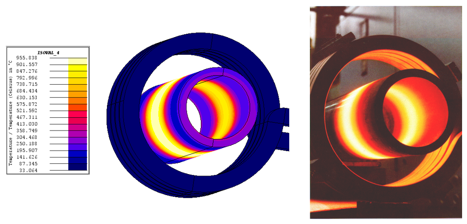 Solid conductor regions are well adapted to the modeling of individual conductors with arbitrary cross-section shapes. An example is provided in Figure 2, in which an induction heating coil was modeled with the help of a solid conductor region in a coupled Steady State AC Magnetic - Transient Thermal application in Flux 3D.
