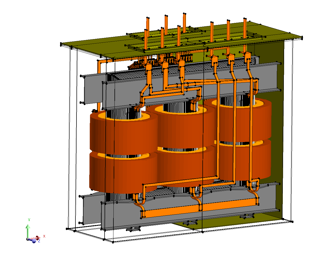 However, and in contrast with the case of meshed coil regions, post-processing local quantities inside a non-meshed coil is impossible. The application example in Figure 3 shows a large power transformer modeled in Flux 3D with the help of non-meshed coils and illustrates this trade-off. Given the complexity of the transformer geometry, the adoption of non-meshed coils to represent its windings results in a more straight-forward model description, but eliminates the possibility of evaluating local quantities in the transformer winding such as the current density or the temperature.