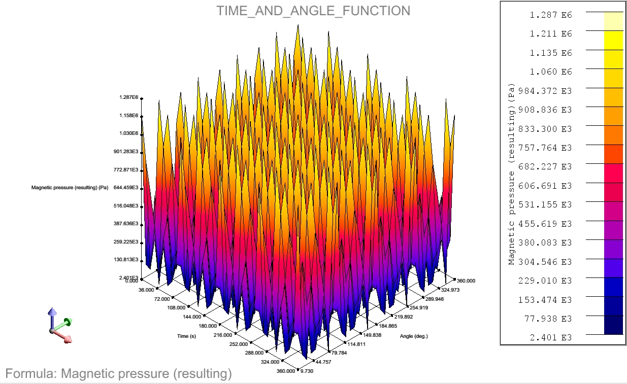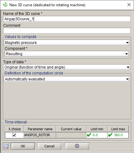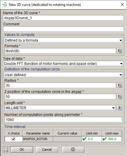 The 3D curves dedicated to rotating machines allow computing a quantity's values along a circle positioned around the rotation axis of a rotating machine, typically in the airgap zone. These values are collected for a set of time steps (feature available only in Transient Magnetic application). Once collected, the values are represented as a 3D plot having in abscissa the time and the angular position along the computation circle. A specific option allows also to transform the time-domain values into a 2D-Fourier domain representation, where data are expressed as a function of the motor-harmonic and the spatial order.Dialog box options