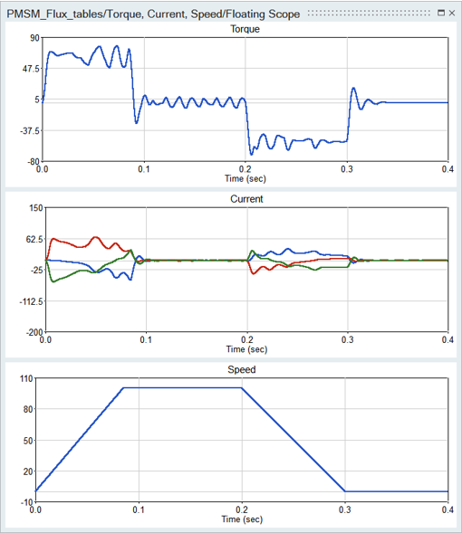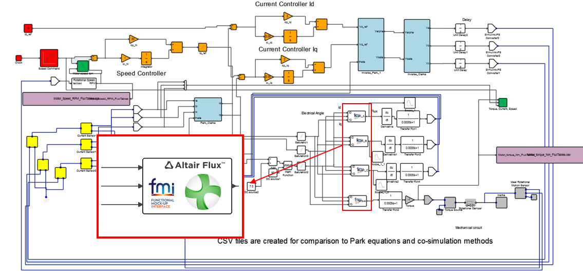The Twin Activate model in Figure 1 simulates the Field-Oriented control of a permanent magnet synchronous machine. An FMU block provides the link between inputs ID (direct axis current), IQ (quadrature axis current), ANGPOS_ROTOR (rotor angular position), and output FLUX_A (magnetic flux of a phase circuit) as shown in that figure.