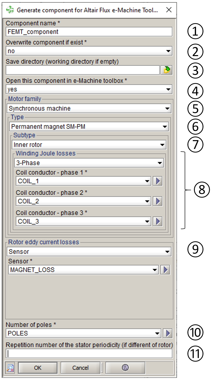- Number of poles of the electrical machine (a geometric parameter is mandatory)