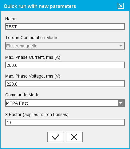 It's possible to create and run a new test with new values of some parameters. The possible parameters to modify are the parameters which no need a re-solving of the Flux project, but only a re-compute and re-display of maps.