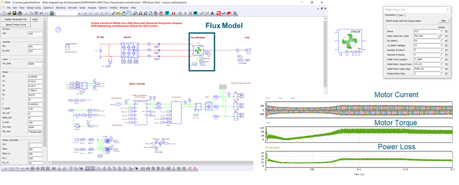 The ElectricDrive library supports block libraries and workflows to easily build system models based on e-motor models from Altair Flux(electromagnetic) and Altair FluxMotorsolutions.