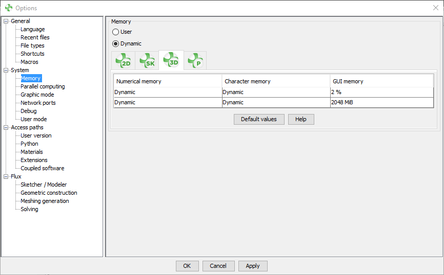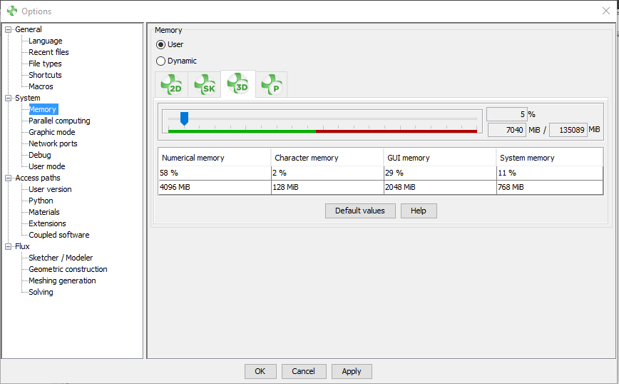 For the moment, whatever the memory management mode chosen (User or Dynamic), the GUI memory is managed only statically, a default value is set according to the modules Flux 2D, Flux Skew, Flux 3D or Flux PEEC.